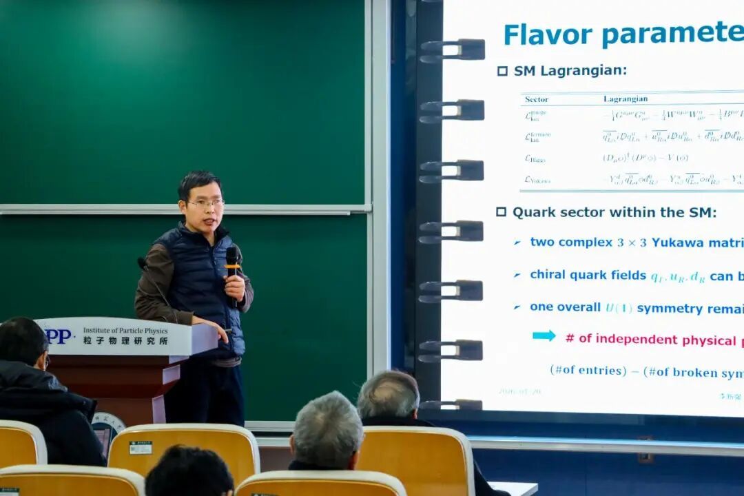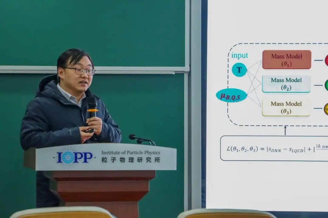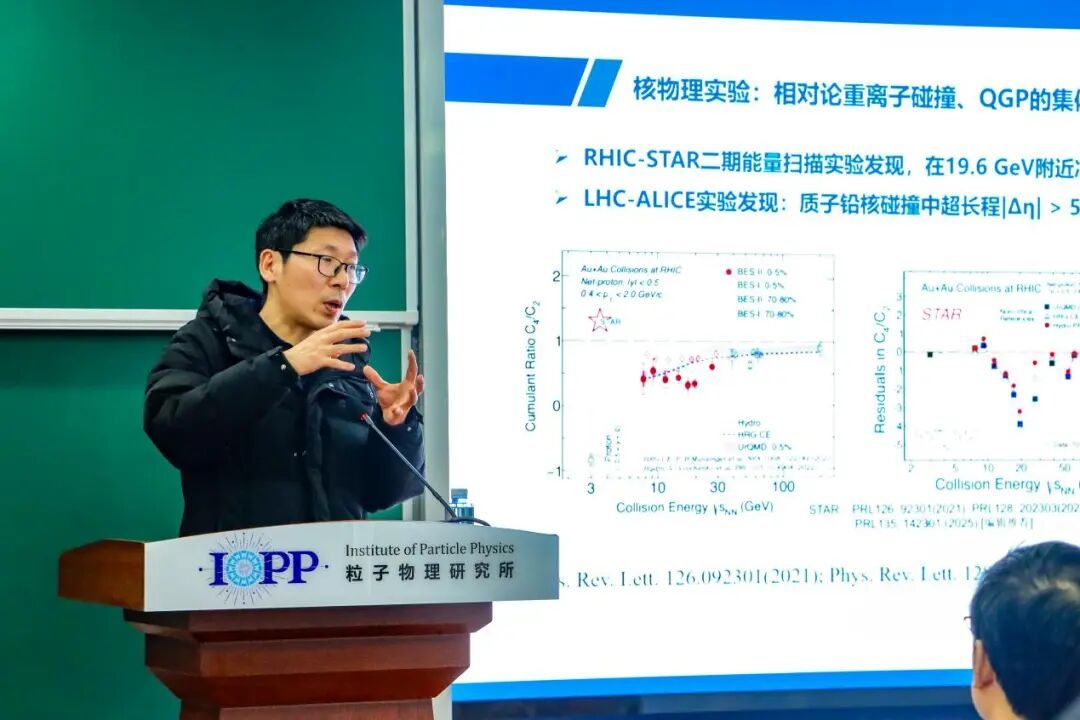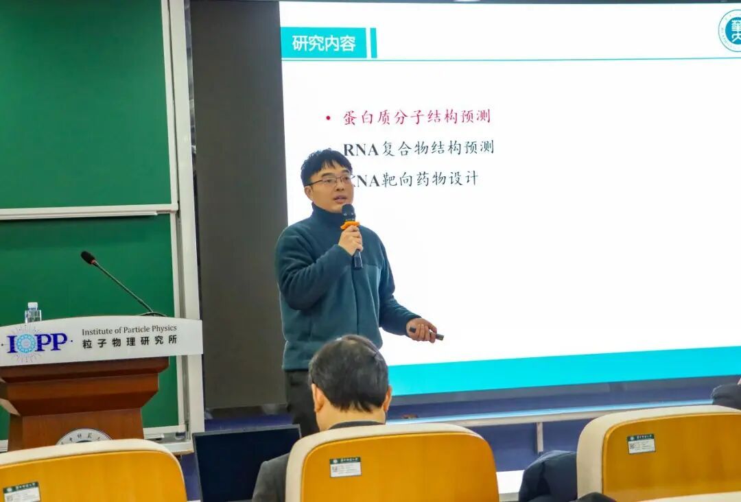 在学术报告环节,六位专家学者依次登台分享前沿成果。赵蕴杰教授率先带来“AI赋能软物质生物分子研究”成果的报告,展现了人工智能在解析生物分子结构、助力靶向药物研发中的关键作用。李新强教授作题为“面向高亮度LHCb和Belle II实验的重味物理理论和唯象研究”的报告,为高亮度下的重味物理实验分析提供核心理论支撑与预测方法。王颖丹研究员分享了“量子开放系统的少体相变研究”,揭示了开放量子环境下少体系统相变的演化路径与调控机制。刘良端研究员聚焦于“时域天文时代光学暂现源的能源机制研究”,结合观测数据剖析光学暂现源的能量起源与爆发过程。庞龙刚教授向大家介绍了“物理信息神经网络在高能核物理中的应用”,展示了AI计算方法在求解复杂核物理方程中的突破。柯伟尧教授介绍了“强相互作用物质中高能部分子的动力学”方面的研究,分析了高能部分子在核物质中的输运机制与能量损失规律。这一系列报告覆盖了粒子物理与核物理、量子科学、天体物理等前沿领域,凸显学科交叉活力,引发师生热烈讨论。