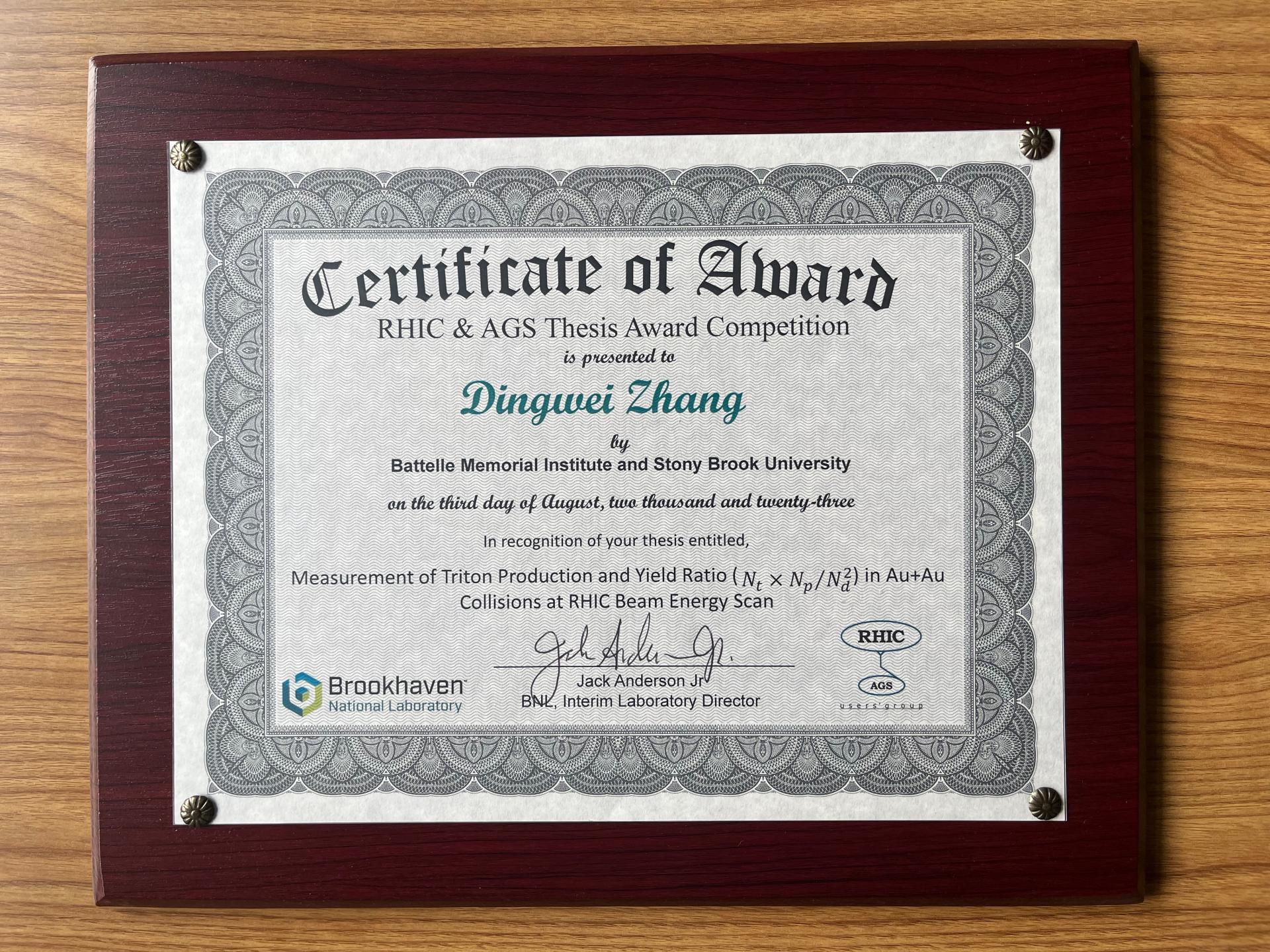 张定伟荣获美国布鲁克海文国家实验室博士论文奖