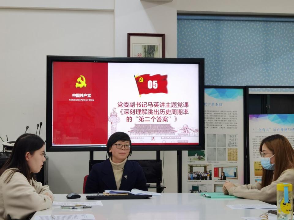 党委副书记马英为全体支部成员讲授了《深刻理解跳出历史周期率的“第二个答案”》主题党课。马英谈到,中国共产党走过百年辉煌历程,始终保持“窑洞对”的高度警觉,并不断探究跳出治乱兴衰历史周期率的新答案,那就是自我革命。深入学习贯彻党的二十大精神,要牢牢把握以伟大自我革命引领伟大社会革命的重要要求,永葆‘赶考’的清醒和坚定,立足新时代学生身份和本职工作,自觉对标从严治党要求,弘扬党的自我革命精神锤炼和锻造自己。马英鼓励支部成员在理想信念、学习工作和人格成长等方面要勇于克服困难,坚持总结和反思。马英和支部成员分享学习周恩来总理《我的修养要则》,从思想、学习、纪律和工作四个方面指出了党支部成员目前存在的不足,希望全体支部成员对自己要高标准、严要求。做到坚定理想信念、坚守人民立场,不断自我净化;坚持问题导向、勇于改正错误,不断自我完善;坚持自我批评、善于总结反思,不断自我革新;坚持守正创新、敢于自我超越,不断自我提高。在组织的培养下,个人主动进步,尽快成长为政治立场坚定、专业能力突出、群众基础深厚、作用发挥明显的新时代青年。