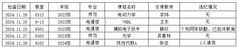 为营造良好学风,落实学生工作引领学风、监督学风的重要职责,根据物理科学与技术 学院本科生学风建设工作要求, 11月25日至12月1日,学院各年级辅导员对本科生课堂、宿舍进行检查,学生整体表现良好,但仍存在少数违纪行为。现将检查情况通报如下: