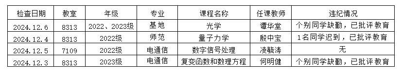 为营造良好学风,落实学生工作引领学风、监督学风的重要职责,根据物理科学与技术 学院本科生学风建设工作要求, 12月2日至12月8日,学院各年级辅导员对本科生课堂、宿舍进行检查,学生整体表现良好,但仍存在少数违纪行为。现将检查情况通报如下: