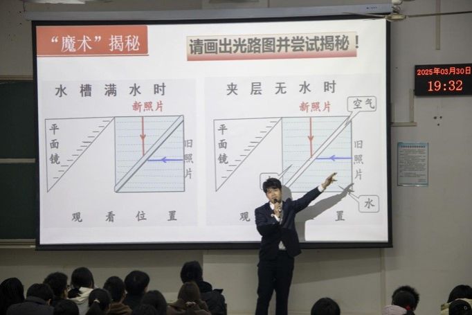 倪佳骏以川剧变脸为导引激发学生兴趣,通过三角形狭缝中是否注水,展示了光从一种介质进入另一种介质时的折射和全反射过程。实验中,红白脸图案的位置变化直观地说明了全反射的发生条件,加深了学生对于全反射的理解。生活中还存在着许多全反射现象,倪佳骏向大家介绍了其中一种——光导纤维。他通过一个“听歌识曲”的小游戏介绍了光导纤维的奇妙用途:用激光发射器把电信号传递成光信号,经光纤传输传到接受器,接受器再把光信号变为电信号传输到喇叭,美妙的校歌孕育而生。倪佳骏还分享了华裔科学家高锟在光纤研究中的故事,激励学生勇于探索、追求科学梦想,将理论知识应用于实际。整堂课下来,倪佳骏以其扎实的专业知识、诙谐幽默的讲课模式以及生动的实验演示,向同学们展示了一节优秀的高中物理示范课。