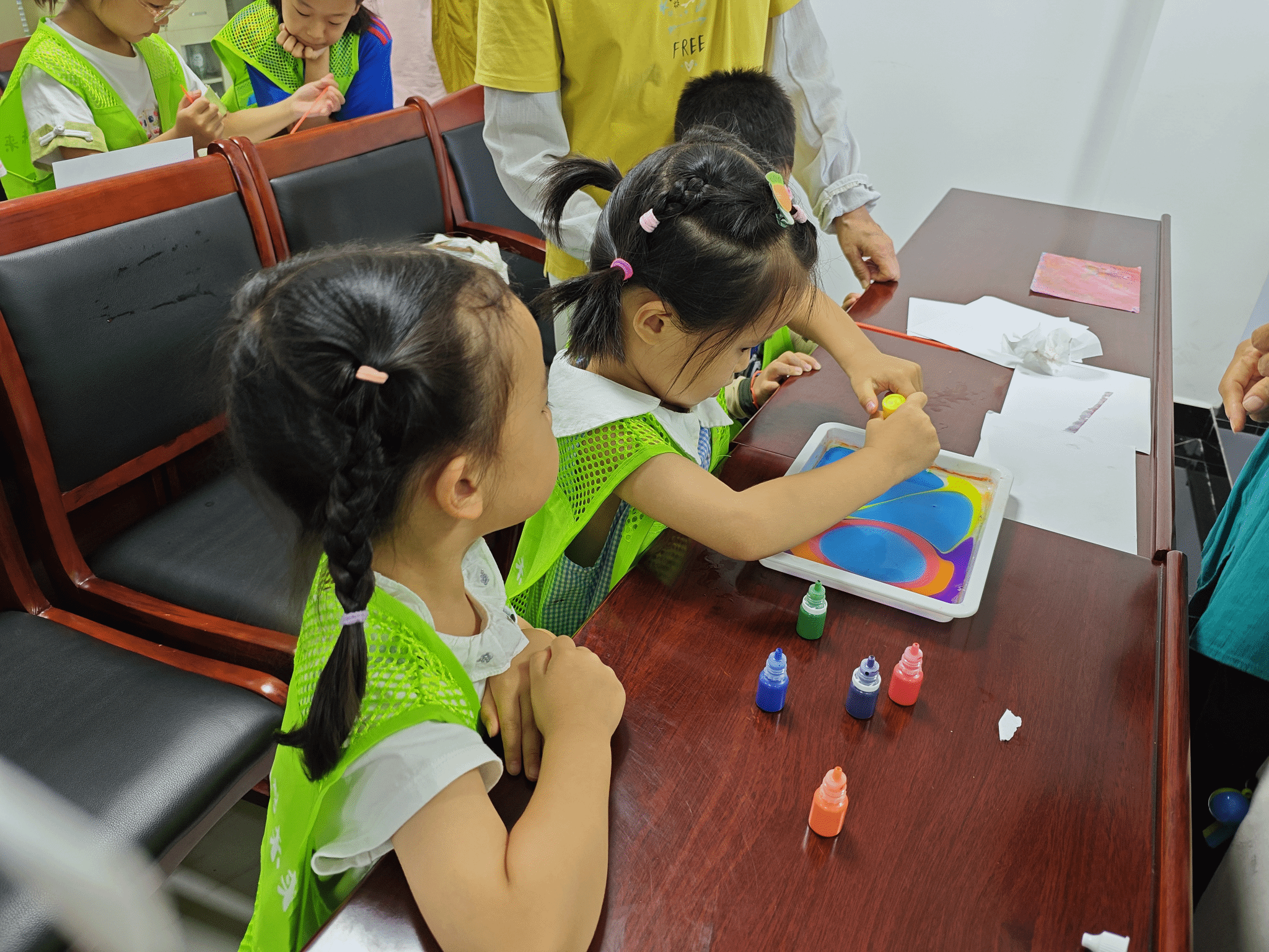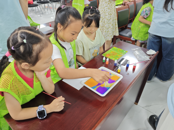 在实践队员的指导下,孩子们亲手体验了水拓画的制作过程。他们小心翼翼地将颜料滴入水中,观察色彩在水面上的自然扩散,再用画棒轻轻勾勒图案,最后将图案拓印到纸上。一幅幅色彩斑斓、独一无二的作品在孩子们手中诞生,现场洋溢着欢声笑语。
