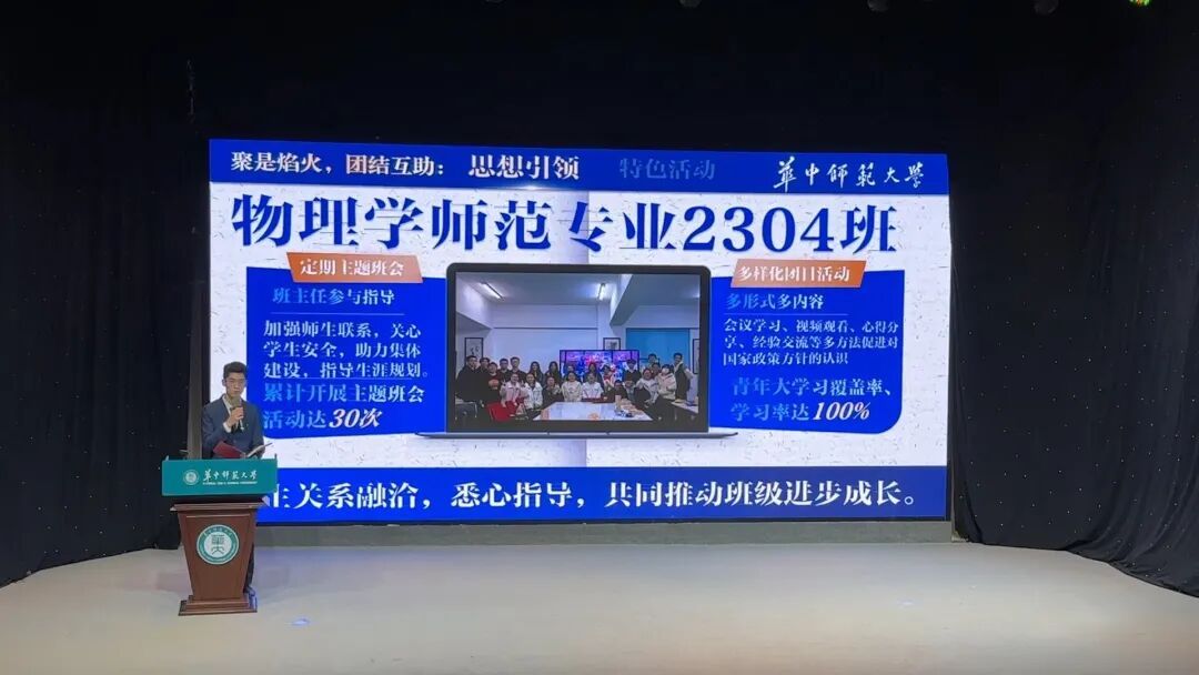 答辩环节,2304班代表以“格物致理,燃灯育魂”为核心,从四方面展现集体风采:“寻光”层面,班级开展30余次涵盖心理健康、职业规划的主题班会,构建“班团一体、党旗引领”格局。33人中26名团员、13名入党积极分子、2名预备党员,获校级“优秀团支部”,4月主题团日为校级优秀案例,“好心情守护计划”班会获校级心理班会策划大赛三等奖。“聚光”层面,班级平均学分绩83.36,80分以上21人,13人获校级奖学金,累计获国家级奖项5项、省部级奖项10余项,多名同学任校院学生组织骨干。“发光”层面,班级通过80余次“微格教学”、1000余次集体活动锤炼“三字一话”技能,30余人次参与返乡物理科普、20余人次投身支教与“暑期云讲堂”。“远航”层面,班级立志以“四有”好老师为目标,在教育路上奋楫争先。
