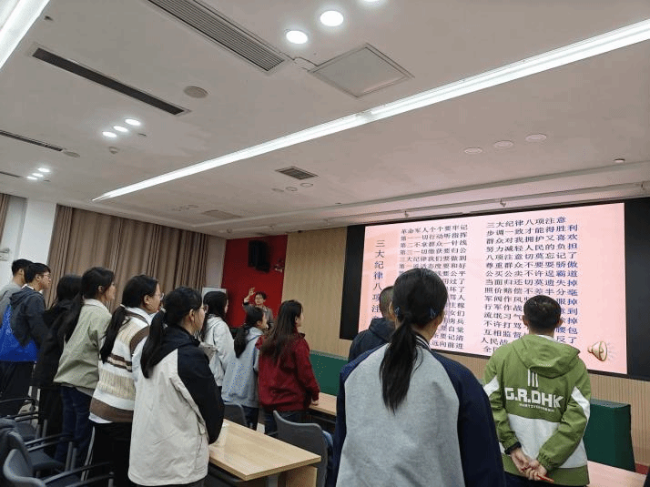 “革命军人个个要牢记,三大纪律八项注意。第一一切行动听指挥,步调一致才能得胜利。”在老师的指导下,同学们学唱经典红歌。嘹亮的歌声回荡在培训课堂,大家分组展示、相互鼓劲,在熟悉的旋律中重温革命岁月,感受红歌中蕴含的团结精神与乐观信念,进一步增强了班级凝聚力与集体荣誉感。