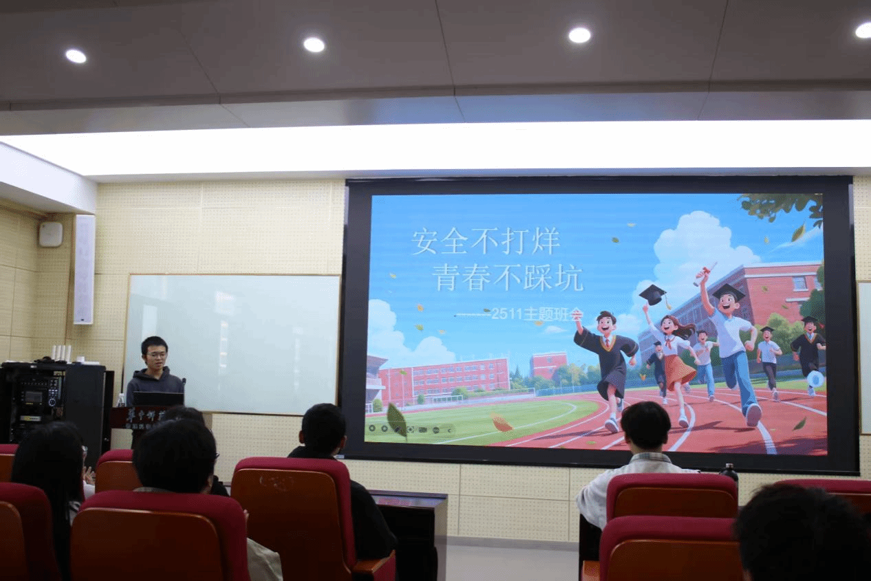 首先开始的是本月主题班会,此次班会以“安全不打烊,青春不踩坑”为主题,班长首先从电信诈骗、宿舍安全出发,为同学们提出一系列安全注意事项,在班会中还穿插了一些问题互动,同学们热情参与答。最后,班主任孙强老师就出行安全、校园安全等作出补充,同学们认真聆听了老师的讲解。