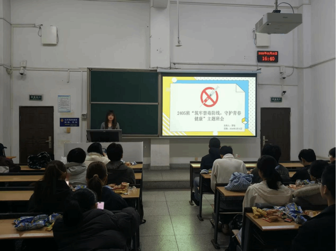 学业总结结束后,班会开展“筑牢青春防线,守护健康青春”禁毒主题教育环节。团支书罗佳带领全体同学系统学习禁毒知识,分析毒品的种类与危害,进一步增强防毒、拒毒的思想意识和行动自觉,牢固树立珍爱生命、远离毒品的坚定信念。