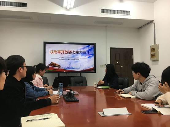 首先主持人组织各位同学共同学习了习近平总书记关于改革开放40周年大会讲话的内容。从一种“伟大精神”、三次“伟大飞跃”、三大“里程碑”、三项“充分证明”、九大“启示”等角度解读了习近平总书记在庆祝改革开放40周年大会上的讲话精神,并总结分享了习近平总书记关于改革开放的10个金句。接着,武燕燕同学介绍了今年全国两会的基本情况、两会取得的重点成果并且分享了自己的学习体会。