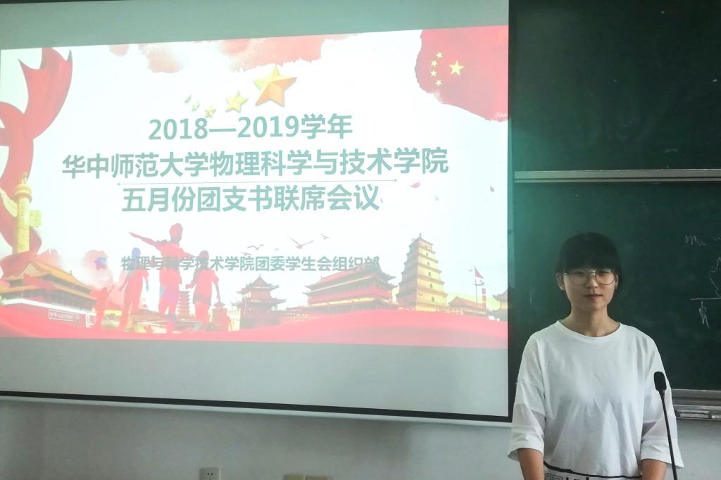 物理科学与技术学院讯(通讯员 汪雅慧)5月21日中午,物理科学与技术学院五月团支书联席会议在九号楼十二楼报告厅顺利召开,物理学院第一团副鲍从发、第二团副雷钰涵、组织部长赵美鑫及16、17、18级团支书出席本次会议,组织部部委李爽担任本次会议主持。