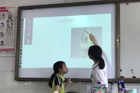 “古代中国有没有科学呢?今天我们一起来看一下古人的智慧”,随后她讲解到越王勾践剑“历千年而不锈”,两千多年的东汉青铜卡尺与现代游标卡尺惊人相似。在讲到西汉雁鱼铜灯“可称清水,灯烟经雁颈融入水中,可少污染”的时候,她向孩子询问:“大家谁知道水要从铜灯的那里流出来吗?”,八岁的李安妮给出了答案,并在黑板上标出了位置。