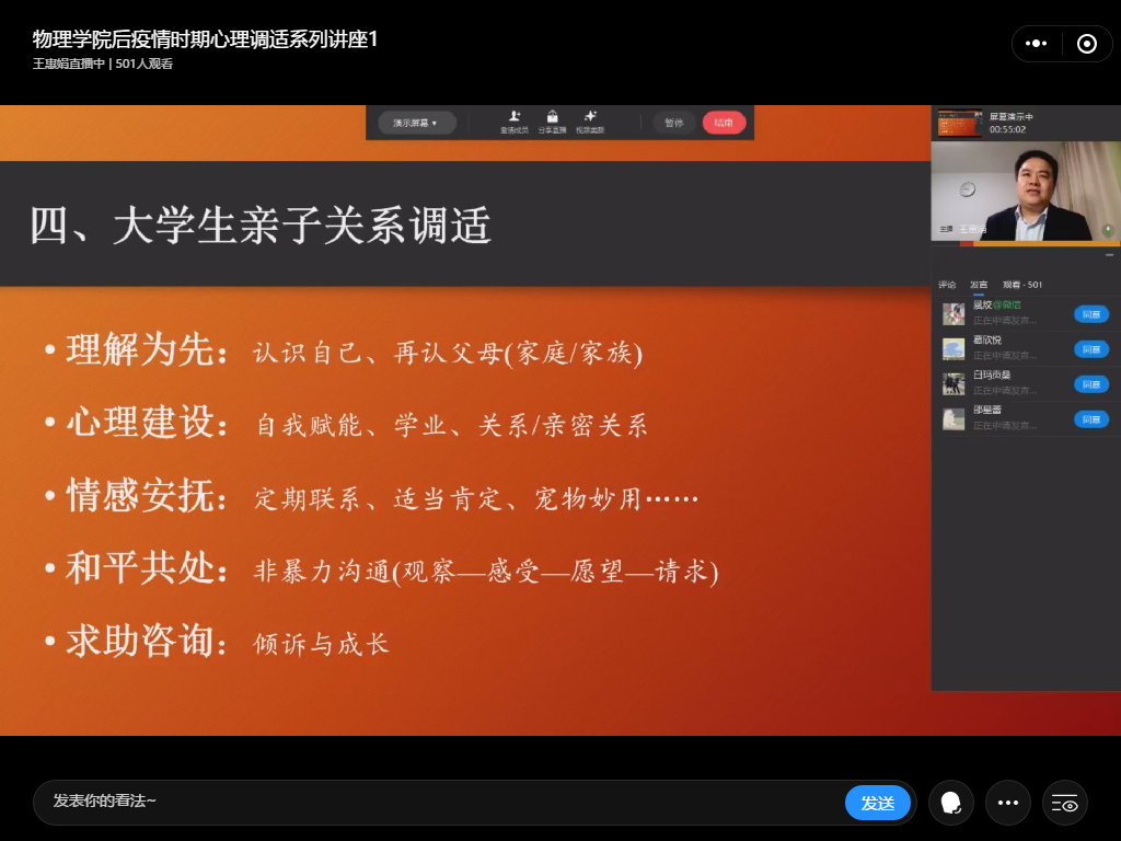 物理科学与技术学院讯(通讯员 刘喆)10月18日下午,物理科学与技术学院“后疫情时期大学生心理调适”系列讲座第一讲“亲子关系调适”于线上举行。武汉理工大学心理健康教育中心教师,临床与咨询心理学博士王铭老师受邀主讲。物院全体同学、部分学生家长观看了直播,活动由学院党委副书记马英主持。