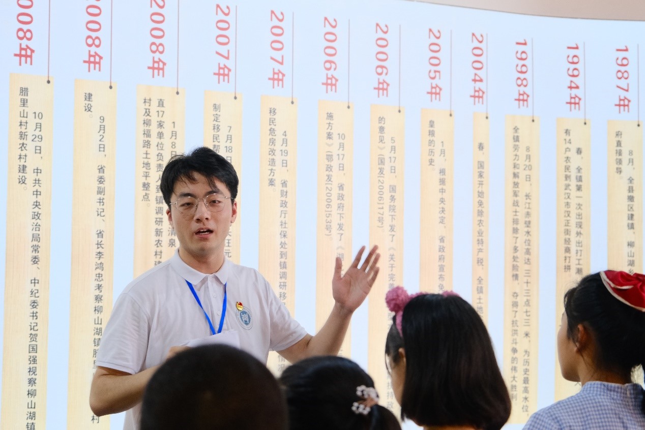 “六十多年前的柳山湖四面沼泽、芦苇丛生、荒无人烟、钉螺遍野。1958年,为响应国家在陆水河上游兴建三峡试验大坝的政策,陆水河两岸9078名库区儿女顾大局、识大体,举家迁往柳山湖。在重建家园过程中,移民百姓们在党的领导下开荒地、挖沟渠、围湖灭螺、建设排灌和堤库,把‘水窝子、虫窝子、穷窝子’建设成田园柳山,在艰辛的劳动中形成了‘顾全大局、舍己为公、艰苦创业、开拓进取’的移民精神。”实践队队员刘金东以时间为线,将重大事件串联起来,向在场的小朋友们讲解了自己的父辈祖辈们移民到柳山湖的原因和重建家园的不易。刘金东表示,同学们在今天的学习过程中最应该记住的就是这“十六字”移民精神。他让大家反复朗读,加深记忆。