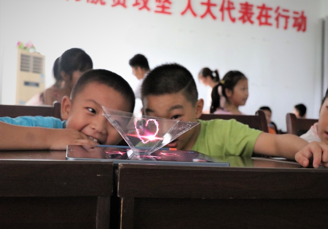 “咦,这个水母我怎么抓不住呀?”7岁的马明宇一边看着空中漂浮着的水母,一只手正在老师给的教具里面四处抓,眼睛里满是好奇,他正在体验着老师带来的“全息投影”实验,从中体验光与影的精彩。实践队队员谭吉馨运用光的折射和光的直线传播原理把武汉科技馆的体验项目“看的见摸不着的玫瑰花”带到了课堂上。早上八点半,教室里拉紧了窗帘、关上了灯,水母、小鱼、蜻蜓等小动物就在教室上空游动,栩栩如生。