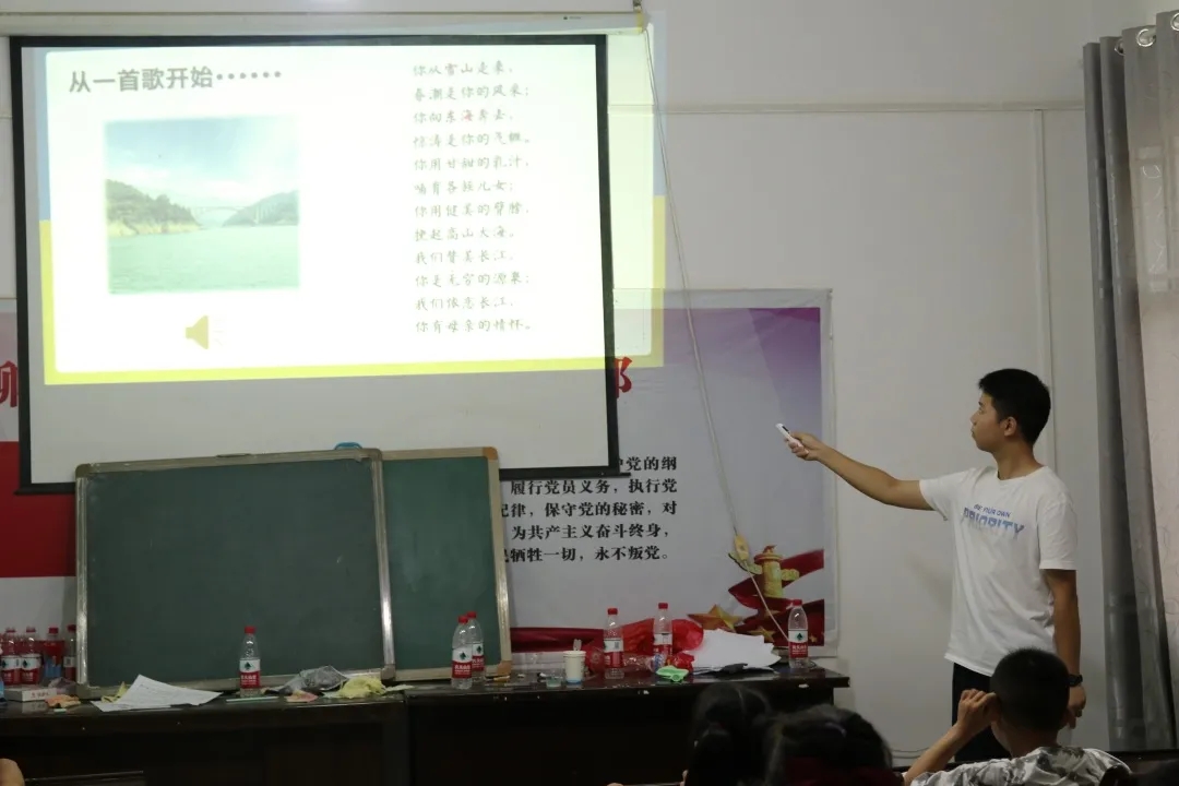 《沿着长江去旅行》课上,实践队队员袁泉首先用一首歌——《长江之歌》带领学生们开启了“长江之旅”。袁泉从长江流经的省份出发,分别向学生们介绍了青海省、四川省、重庆市、湖北省等城市。在介绍湖北省时,袁泉还对三峡的移民历史做了简要介绍,希望学生们能够继承并发扬“顾全大局、舍己为公、艰苦创业、开拓进取”的移民精神,共同建设更美好幸福的家园。