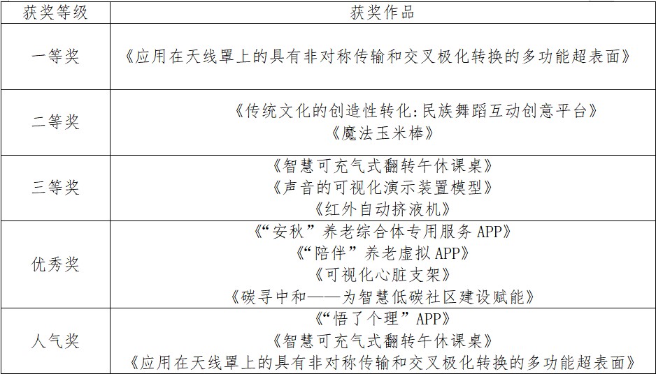 在比赛中各个作品都展现出了选手的创新设计思维与扎实的学术知识,同时也体现了当代青年对于社会问题的关注与思考。智慧可充气式翻转午休课桌针对进行普通翻转课桌进行了可充气性与可移动性改进,着手解决学生午休问题。具有非对称传输和交叉极化转换的多功能超表面展现了结合吸波和投射极化转换原理创意设计。可视化心脏支架利用红外线的精密测量技术针对解决冠心病问题。