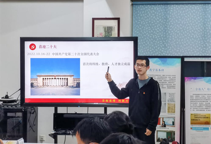活动前,2012班班委已将班级前两年的集体成果与每位同学的个人简历制作成册,会上每位同学人手一本《2012班大三阶段简历册》。班长梁婧妤首先介绍班级简历,开启了班会的序章。梁婧妤带大家共同回顾两年多来班级一起走过的历程——班级组成、集体荣誉、班委更替、各次班会以及团日活动等。接着,预备党员、2020级党员先锋队队长赵卓伟以“贵师重傅,科教兴邦”为主题宣讲党的二十大精神,他从教育、人才、科技创新方面入手,紧密结合未来教育工作者的身份,深入阐述自己的思考。