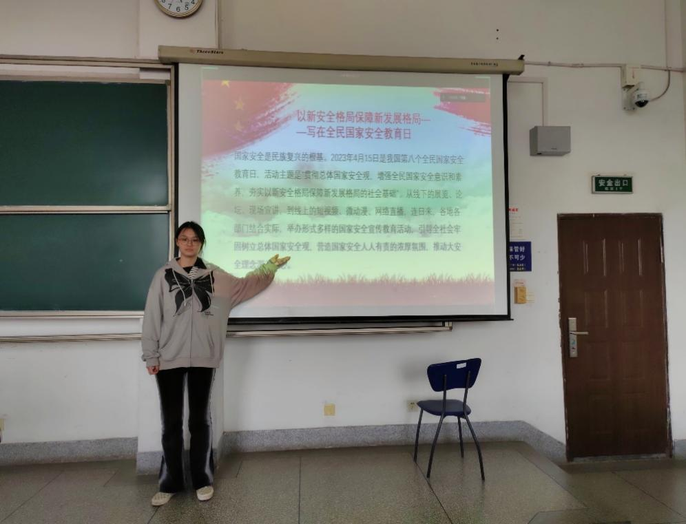 活动中,于慧馨为大家普及安全教育相关知识,讲解国家安全的基本内容,带领同学们学习领会习近平总书记重要讲话精神。于慧馨讲到,国家安全的覆盖面非常广泛,涵盖了国土、经济、网络、科技等诸多要素,是每一名公民都不能忽视的重要因素,也是需要全社会共同维护的安全防线,作为在校本科生,同学们要格外重视总体国家安全观。