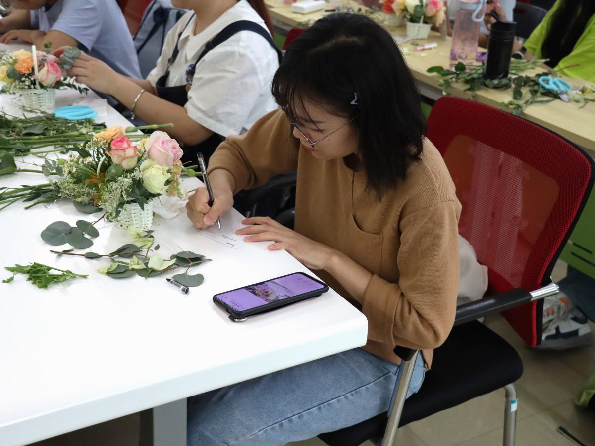 工作人员刁宇轩表示:插花艺术能做到将美育同心理健康教育相结合,同时还能起到美化环境,装点生活的作用。插花前通过便签纸抒发近期的不顺事件,插花后通过心愿卡片对未来寄予期望,使大学生在活动过程中身心得到放松,情绪得以释放。