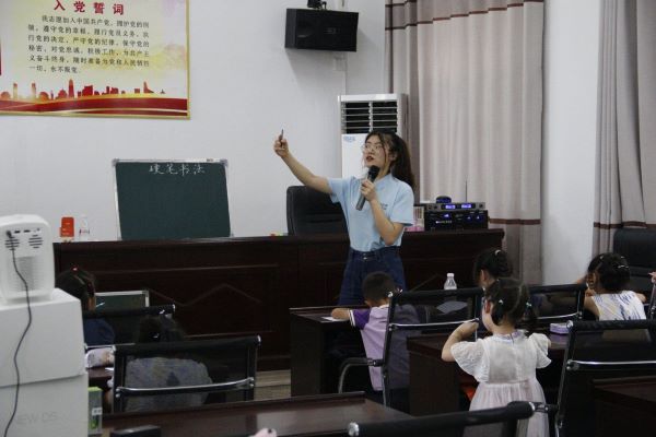 下午,教学组组长周新颖展开了硬笔书法的教学,考虑到学生的书写基础与需求,她从最基础的握笔姿势与笔画入手,并请学生到黑板前书写汉字。同学们踊跃举手,课堂氛围十分活跃。在学生自行练习汉字书写时,周新颖走下讲台进行指导,帮助初学书法的孩子们纠正错误。周新颖认为,对于孩子们的书法学习,首先应培养正确的写字姿势,养成良好的书写习惯,一步一步稳扎稳打,才能逐步做到规范、端正与美观。