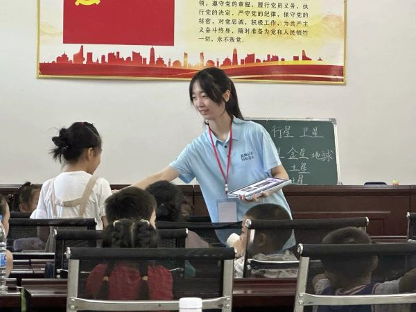 7月11日是湖北省咸宁市赤壁市柳山湖镇宝塔山村“希望家园”夏令营开营的第二天。为启迪学员们的科学思维、拓展视野,锻炼身体素质,培养审美情趣,让孩子们在多彩趣味的课程中学到知识,领悟道理,华中师范大学物理科学与技术学院党员国情学习与实践队(以下简称“实践队”)将宇宙科学、趣味英语、纸巾绘画、阅读分享以及户外体育等各类课程引入素质教育课堂,促进孩子们全方位发展。