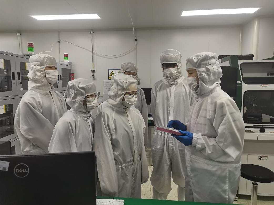 实践队还参观了电子学实验室。负责研发硅探测器的刘佩莲老师带领队员们进入实验室。队员们第一次穿上防护服,第一次通过风淋间,看到了实验室里正在研发的探测器结构以及实验器材。最后,高能所的张杰老师介绍了很多基础的电子学设备元件和现在高能所正在进行的电子学芯片研发工作。