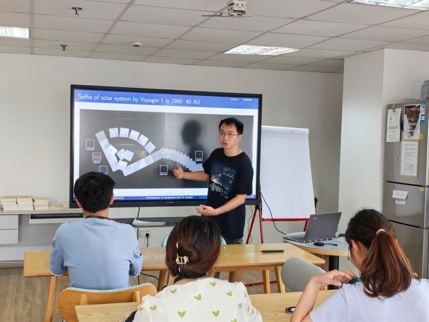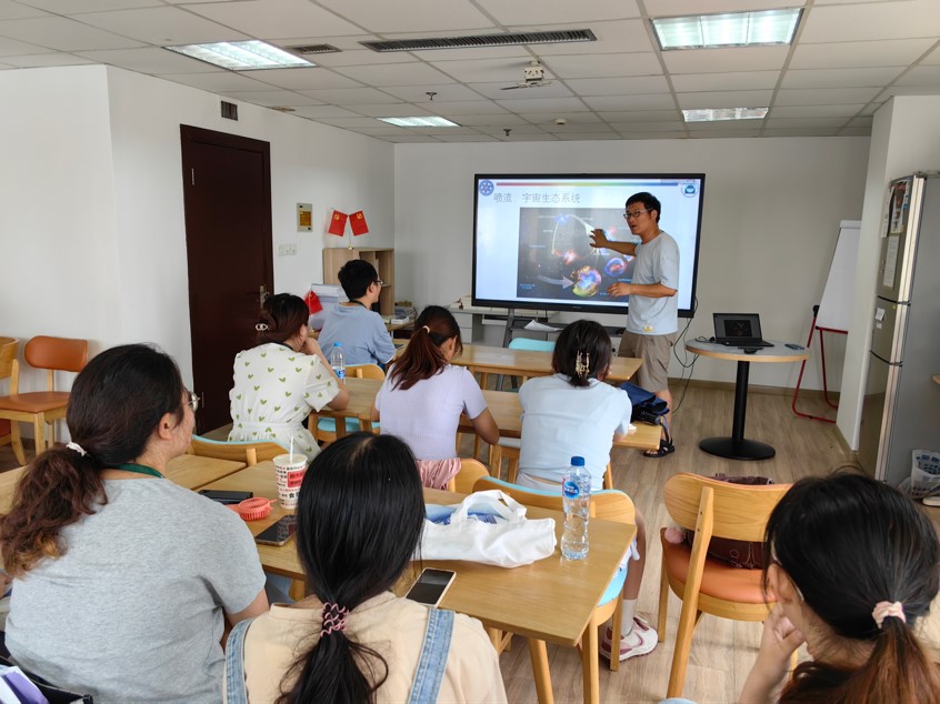 7月15日上午,实践队前往上海天文台听取专家的学术报告。黄辰亮老师作了系外行星搜索相关的报告,他介绍了探测系外行星的原因、搜索系外行星的方法以及系外行星大气的研究。黄老师的报告紧凑连贯,以丰富的图表和严谨的科学理论介绍了系外行星搜索领域。此后是吕行老师进行的《从“恒星胚胎”到“恒星宝宝”——恒星的诞生》的报告,他为队员们介绍了恒星形成的研究概况、恒星形成的概貌、恒星形成中的物理以及射电天文学相关内容。吕老师的报告视野开阔,结合物理知识,从多方面为队员们介绍了相关领域,启迪智慧。最后由陈亮老师作了《宇宙中黑洞的吸积和喷流》,陈亮老师的语言形象生动、深入浅出,为队员们讲解了关于黑洞的研究历史和研究方法。