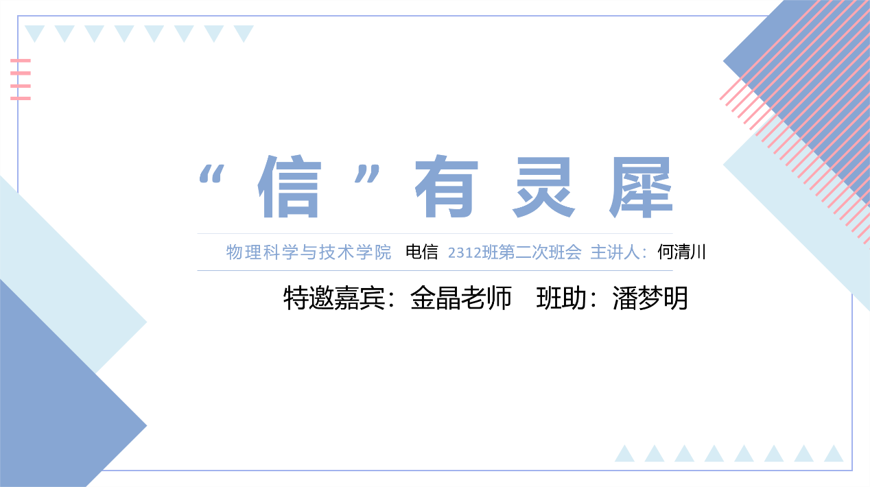 希望电通信2312班是一个团结友爱的班集体,就像此次班会主题“信”有灵犀一样,希望大家有默契,心有灵犀。也希望大家既能在集体活动中放松自己,也能够和同学们在交流分享中有所收获!期待下一次班会。