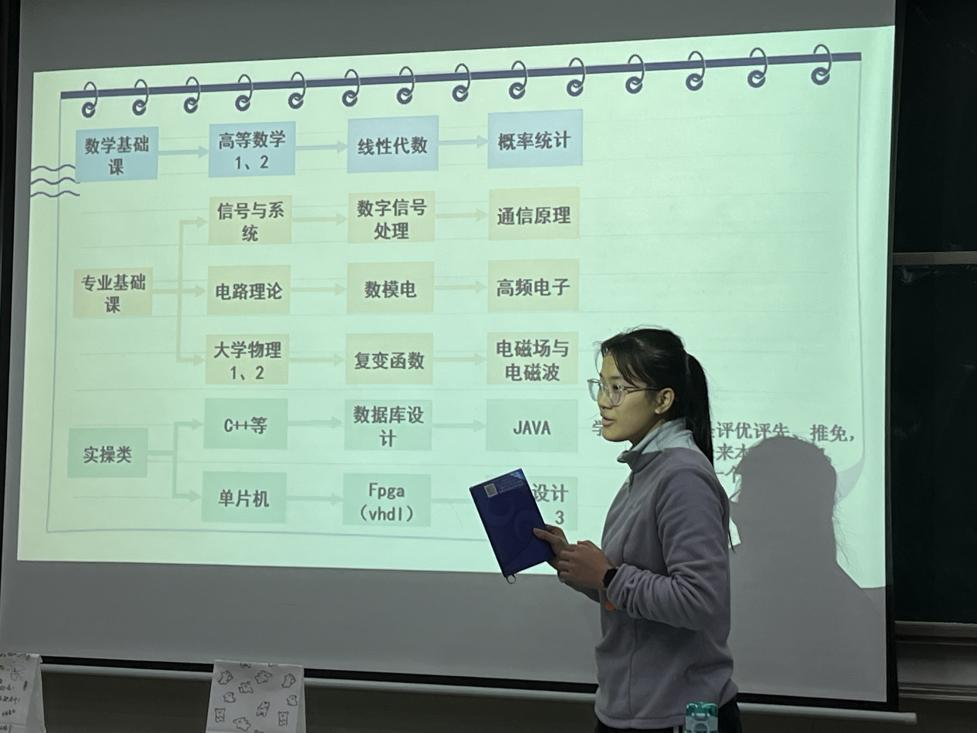 2020级通信工程专业的胡钰从专业学习、科研竞赛、体育锻炼以及假期安排四个方面进行分享。她将电信专业课串联在一起,介绍了每个学期所学课程内容以及难度,用自身经历告诉同学们学业绩点在保研推免以及找工作方面的重要性,并且围绕期末备考提出有效建议。此外胡钰还向大家介绍了科研竞赛的小知识,如蓝桥杯、数学建模、电子设计大赛。也建议同学们在假期多去参加比赛项目,在实践中锻炼自己。最后,胡钰希望同学们好好学习,以健康的身体状态和精神状态度过大学四年。
