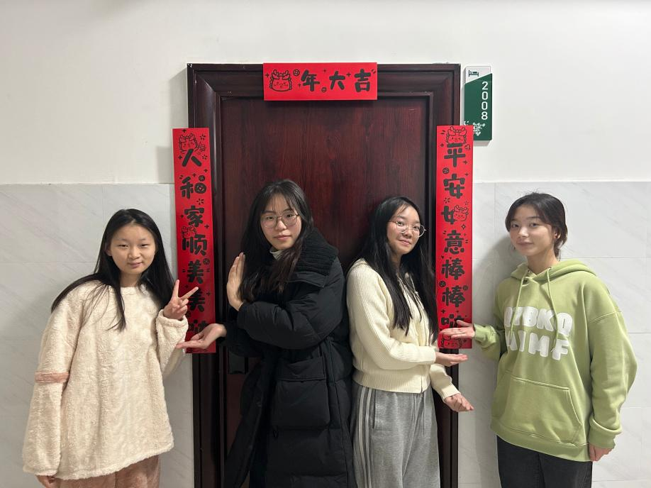 张贴春联、福字、挂饰,开启一场别开生面的新年装饰热潮,将寝室打造成一个充满幸福氛围的温馨角落。寝室门口,各式福字仿佛是邀请新年好运的小使者,让整个寝室充满了温馨与喜庆。不仅为同学们带来了幸福的氛围,拉近了寝室成员之间的感情,架起了同学们与辅导员的沟通桥梁,也为新年的到来增添了一抹美丽的风景。
