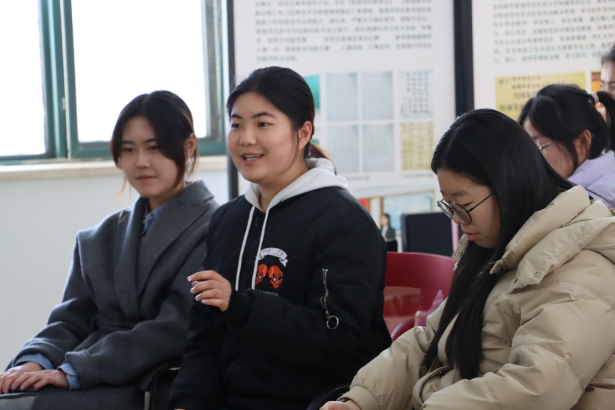 今天通过和四位老师推心置腹的谈话,我感受到了来自于女性和时光沉淀的力量。在与老师们交谈的过程中,我从老师们的自身经历、学识阅历中体会到了温柔、知性、坚定的女性力量,同时也缓解了我在自身发展、未来规划中的一些不安与焦虑。老师们教导我们:不要害怕,大胆尝试,只有努力过了才会有更好的结果。通过今天的对话,我更加坚定了自我的目标与追求,勇敢地奔赴属于自己的未来。