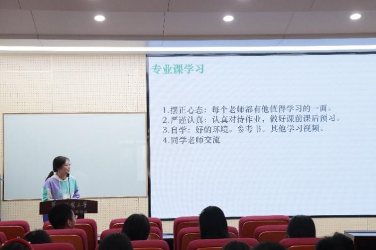 2021级基地班梅雪仑提醒同学们在专业课的学习过程中要摆正心态,认真对待作业,做好课前预习和课后整理归纳。她以自己学习《电动力学》这门课程的亲身经历强调了自学的重要性,并推荐了一些优秀的参考教材和学习软件。