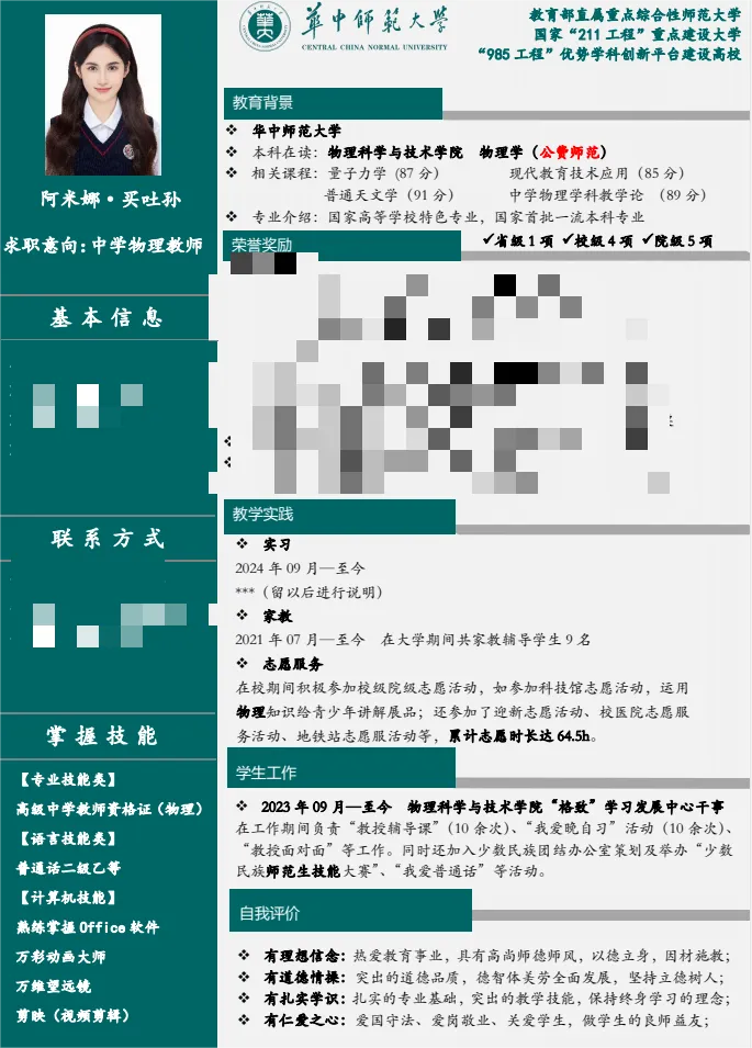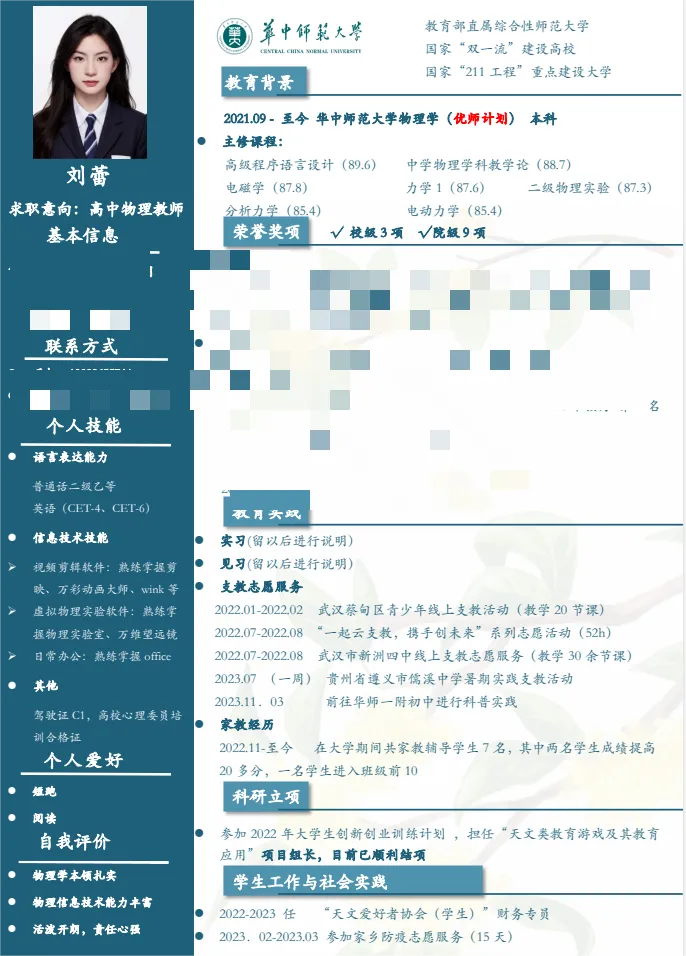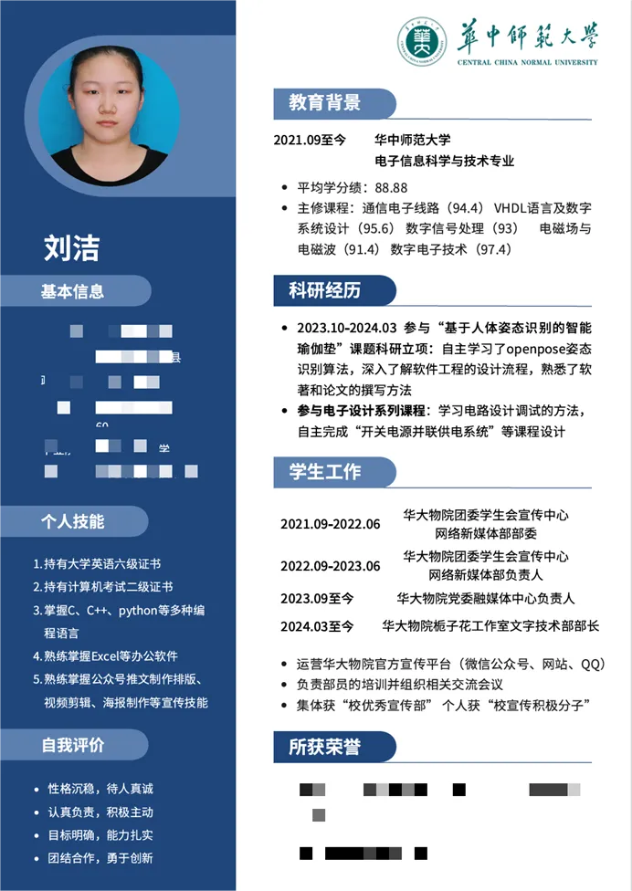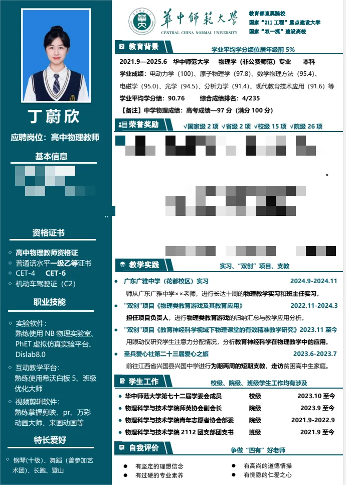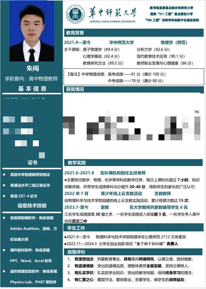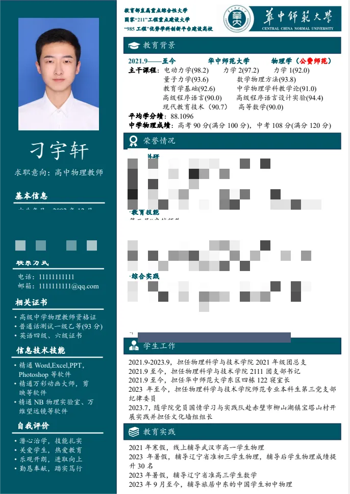 为提高同学们的简历制作水平和就业竞争力,进一步引导学生在大学阶段查漏补缺,为未来的职业生涯奠定坚实基础。物理科学与技术学院2021级本科生于2024年3月举办第二届“卓越师范生计划”之简历制作比赛。本次比赛共收到个人简历作品354 份,经评委线上打分评比,共产生一、二、三等奖若干,下面跟着小phy一起学习本次大赛的部分优秀简历作品吧!