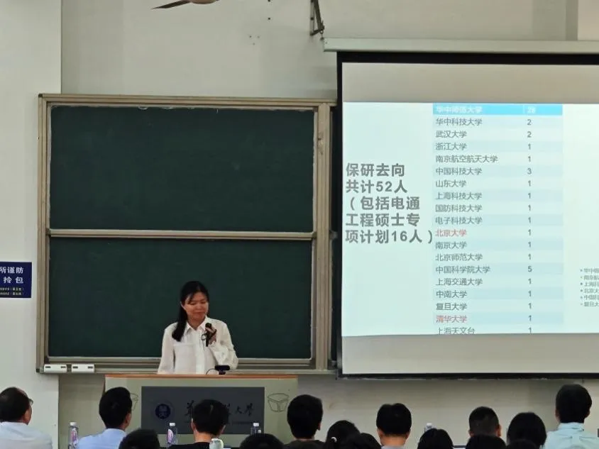 随后,同学们按照专业分别在9401以及9403教室聆听电通信和物理学专业教师对升学形势以及学院本专业的研究生教育情况的分享。