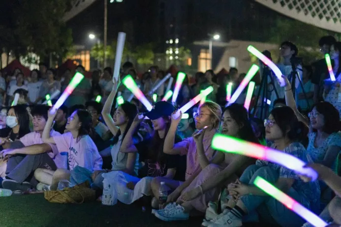 灯光闪烁,歌声回荡。草坪上,观众们挥舞着手中的荧光棒,打开闪光灯为喜欢的表演欢呼呐喊,他们与歌手和舞者们共同完成了这场青春与音乐碰撞的盛宴。