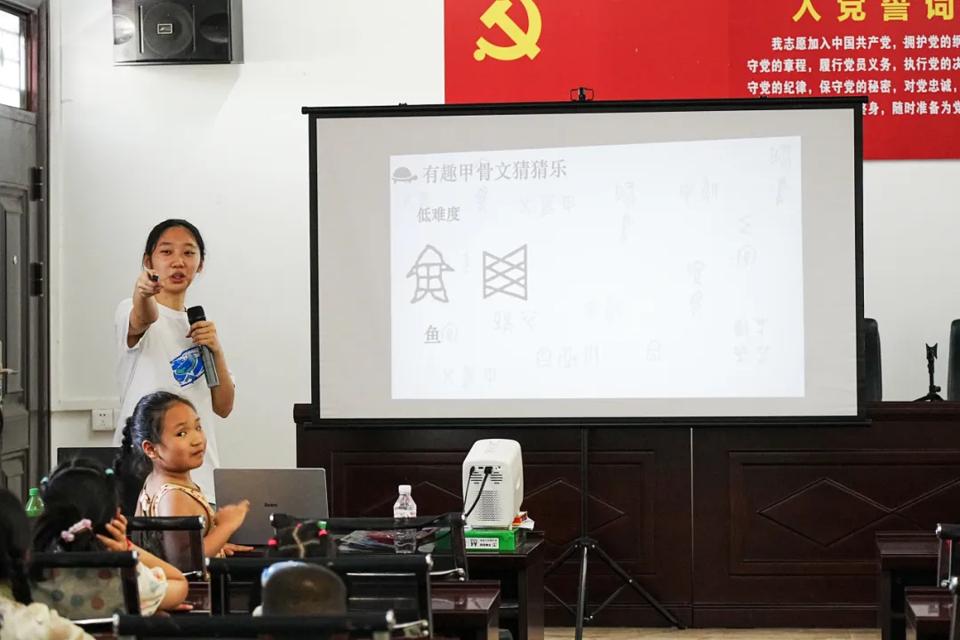 在上午的第三节课程中,实践队队员王雅霖进一步深入传统文化主题,为孩子们带来了关于甲骨文的精彩课程。她将这节课程巧妙地从甲骨文名家引入,采用“猜一猜”的互动形式,不仅带动了课堂氛围,也锻炼了他们独立思考的能力。随后,王雅霖对甲骨文的“象形、指事、会意、形声”四种基本形式进行了生动形象的描述和解释,用通俗易懂的语言和具体的实例,使孩子们对甲骨文这一古老的文字体系有了初步的认识和理解。在此基础之上,她组织了“有趣甲骨文猜猜乐”的活动,加深了孩子们对甲骨文的理解,在孩子们的心底种下了热爱传统文化的种子。