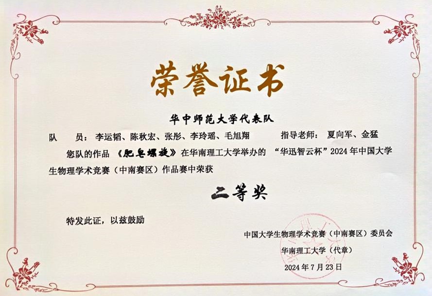 自今年2月华中师范大学2024年CUPT团队正式组建以来,团队成员刻苦学习,勤奋钻研。夏向军、金猛、黄林等老师组成的指导团队,坚持每周召开讨论会悉心指导,和同学们研讨比赛题目。暑期,全体参赛同学留校备赛,定期向老师们汇报参赛题目的研究进展,进一步完善理论与实验探究。进入中南赛最后的冲刺阶段,指导老师担当评委,指导同学们进行了多场内部模拟对抗演练进行“热身”。本次比赛获得的各个奖项,展示了我院参赛队员对题目良好的理解和完成度以及团队优良的团结协作风貌。
