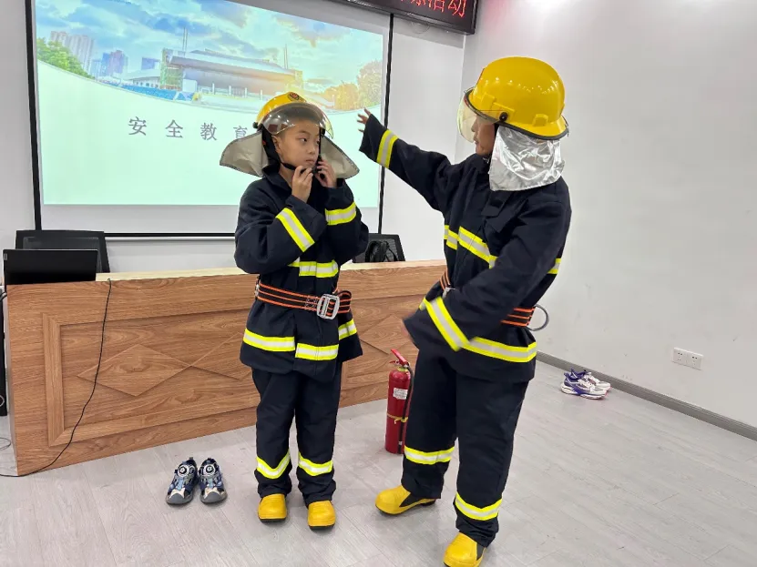 消防员详细讲解了如何识别火灾隐患及火灾预防方法。随后,消防员还演示了如何正确拔打报警电话,并邀请小朋友试穿消防服、学习灭火器的使用方法。通过现场演绎和实物讲解,孩子们近距离接触了消防装备,增加了对消防工作的认识,加强了对消防安全的重视。