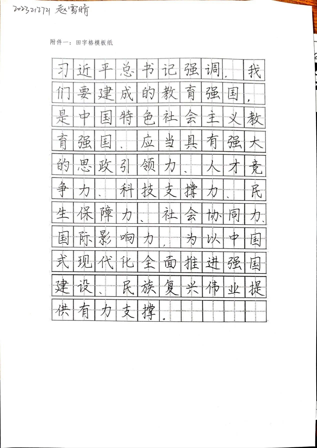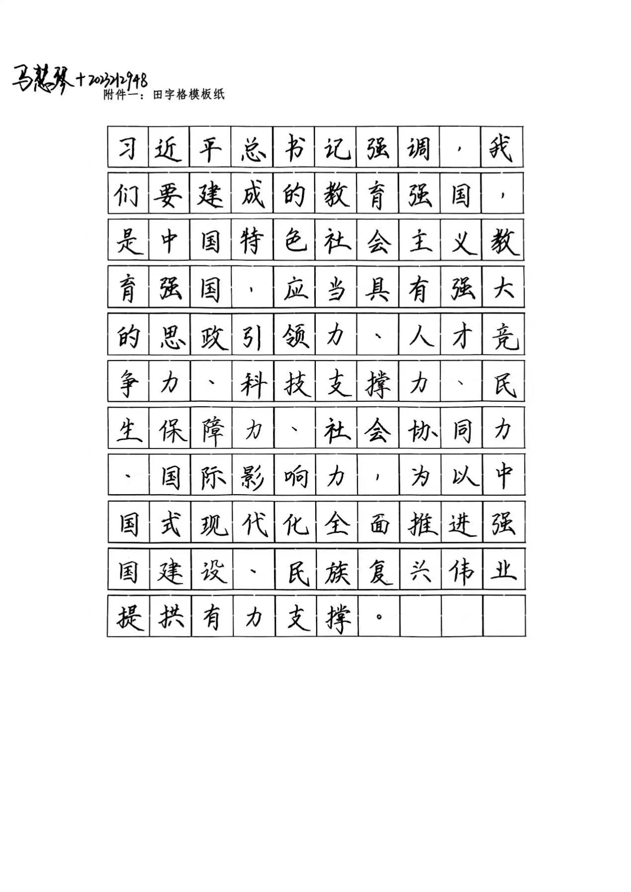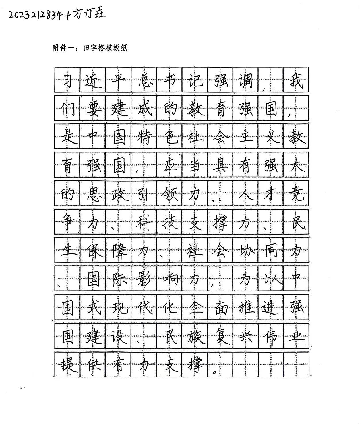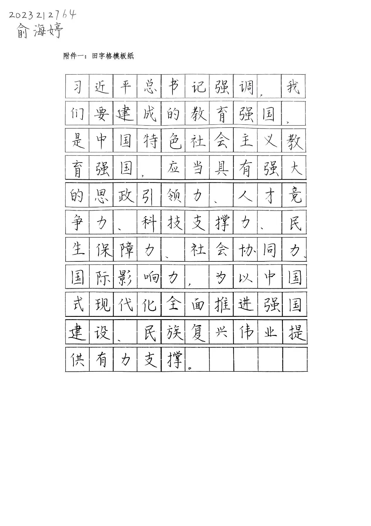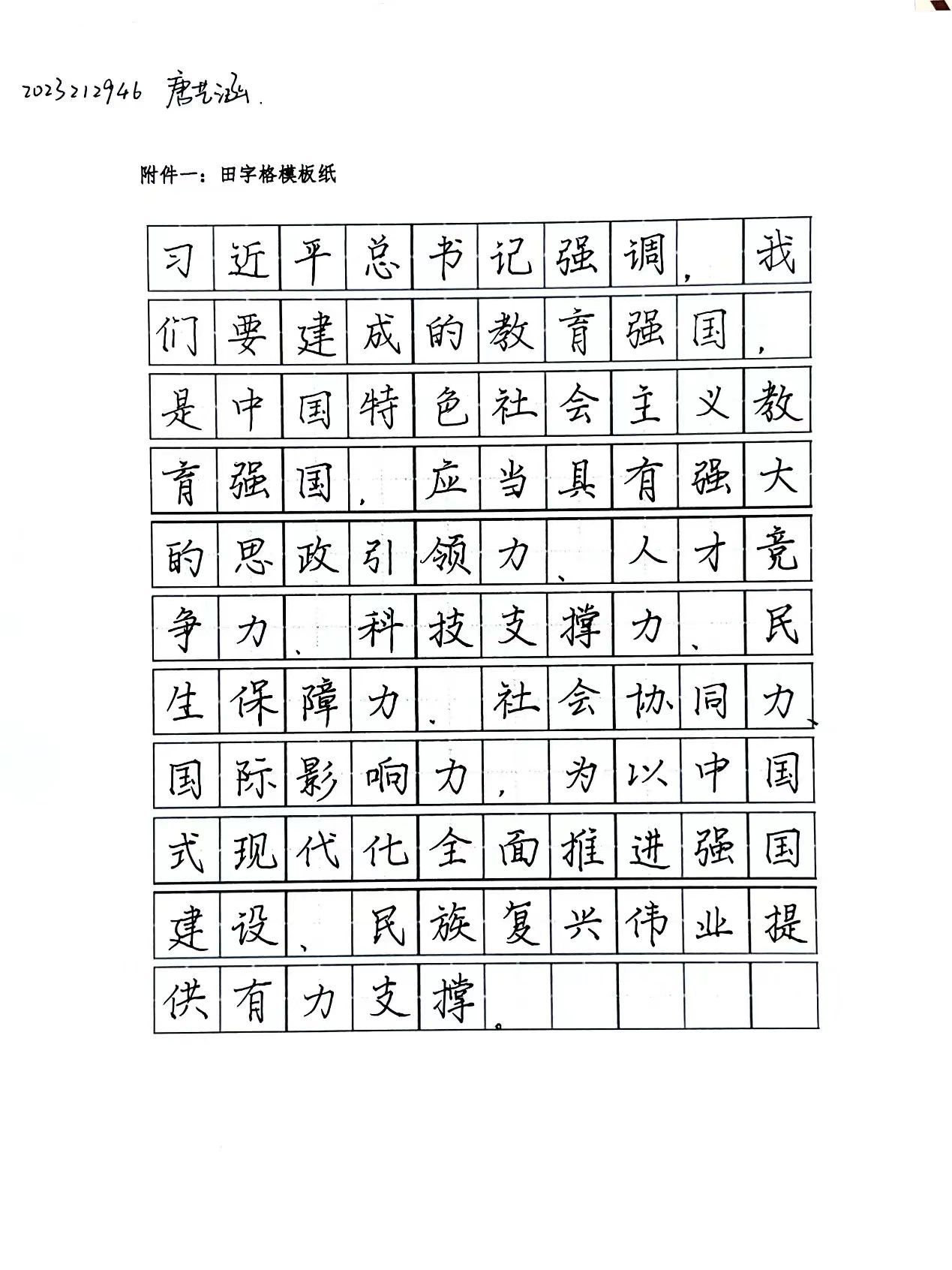 比赛采用线上形式进行,共有145名2023级学生积极参与。参赛者需在规定时间内完成对指定文段的书写。参赛作品风格各异,精彩纷呈。正楷作品的一笔一划,无不透露出参赛者们的严谨态度与认真精神。有的作品笔力遒劲,墨色饱满,展现出作者深厚的书法功底;有的作品如松柏般挺立,体现了楷书的严谨与庄重;还有的作品清新脱俗、雅致温婉,宛如行云流水,自然流畅。这些精心创作的书法作品如璀璨星辰,展现着学生们在硬笔字技能上的卓越技能,以及他们致力于提升自我、精进师范技能的坚定决心。