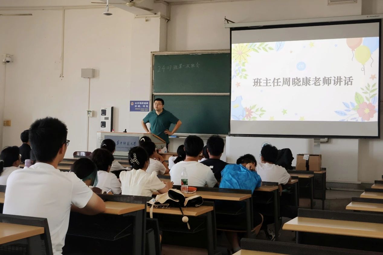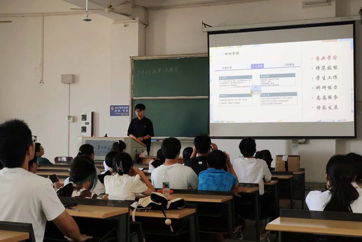 9月28日下午,物院2024级公费师范专业2407班召开了入学以来的第一次班会,班主任周晓康和2407班全体新生们齐聚于九号楼9301教室。此次班会由2407班班主任助理张政豪主持,共分为四个部分进行。