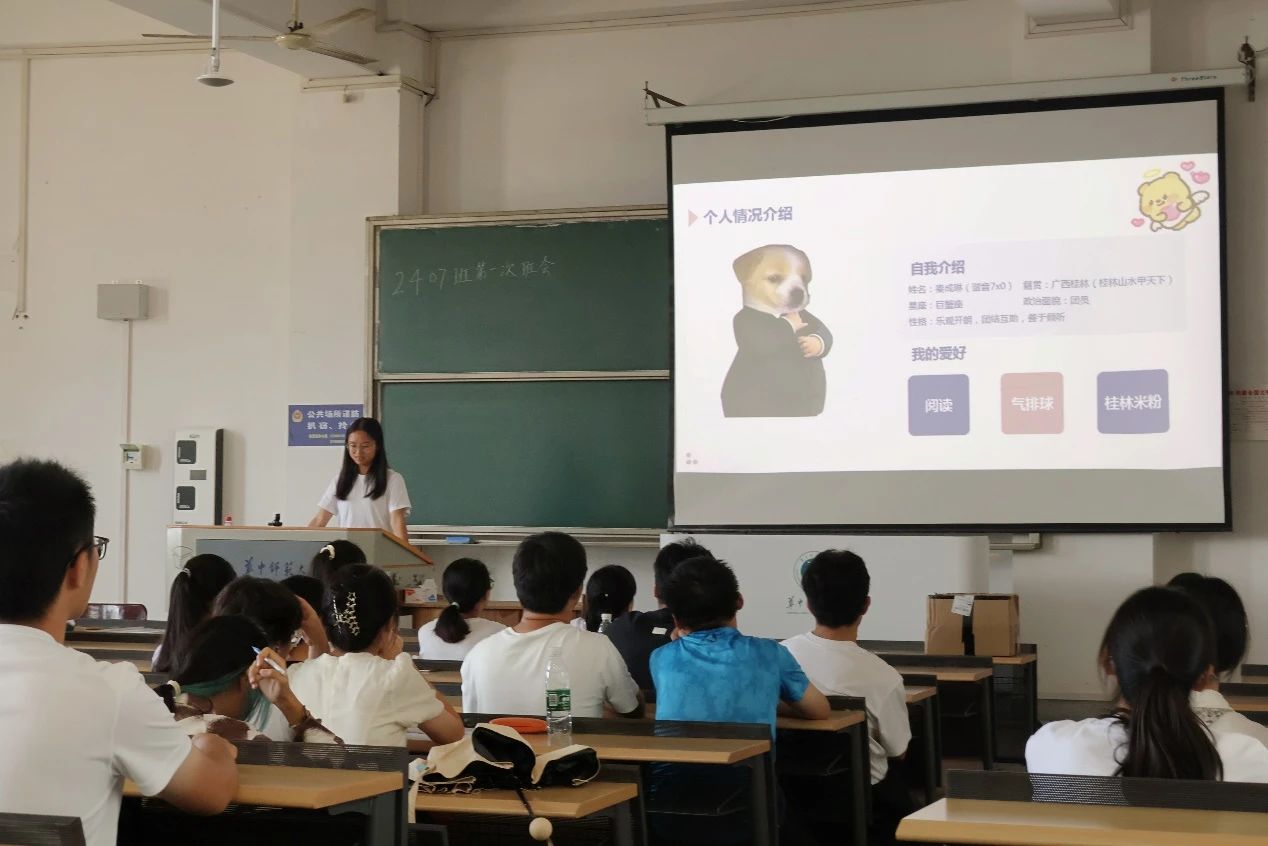 接着,班助张政豪进行自我介绍,以学长的身份分享了自己的大学生活体会。同时,考虑到许多新生缺乏PPT制作经验,他以自己制作的PPT为模板,向同学们介绍了PPT制作方法和大学生活的努力方向。