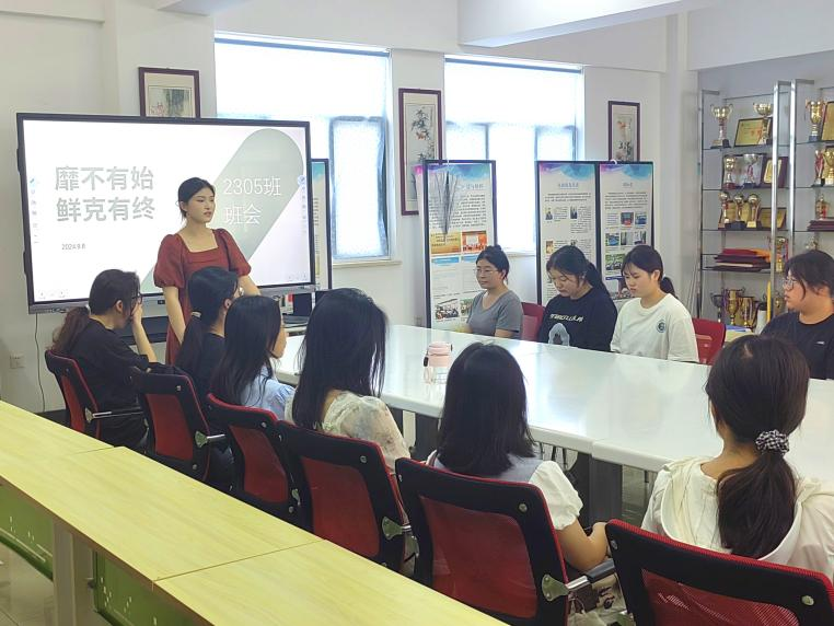 在秋日的温柔余晖中,9月5日下午,2305班迎来了一场别开生面的“靡不有初,鲜克有终”主题班会。班会旨在引导同学们让初心引领方向,以坚持为翼,时刻反思自省,共赴辉煌彼岸。2305班全体同学参与,活动由班长姜米主持。