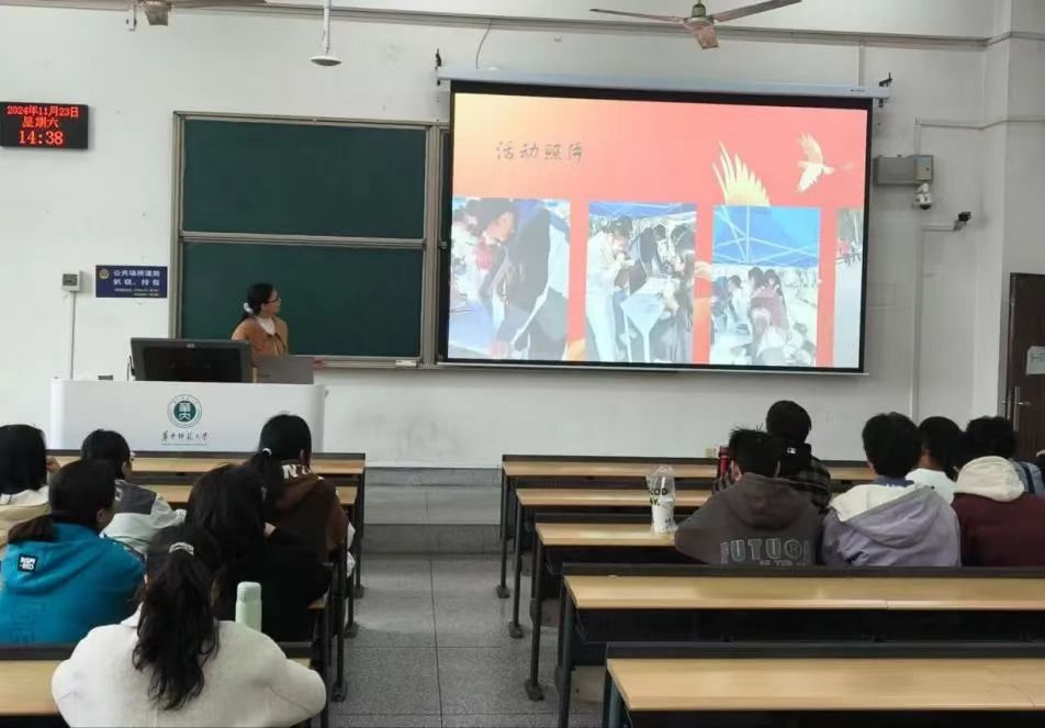活动中,借助照片等资料,同学们回顾了当日上午举办的第三十二届“创新杯”科学文化节活动,2402班部分成员参与了该活动的志愿工作。丁菲娅鼓励同学们踊跃参与志愿服务,在实践中学习成长。