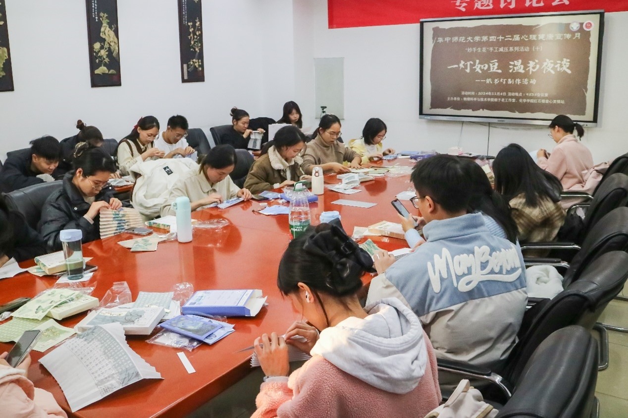11月29日,华中师范大学第四十二届心理健康宣传月“妙手生花”手工减压系列活动——“一灯如豆,温书夜谈”纸书灯制作活动于9号楼9535会议室举办。本次活动由华中师范大学物理科学与技术学院栀子花工作室和化学学院红石榴壹心灵驿站联合举办,全校各学院20位同学参与其中。