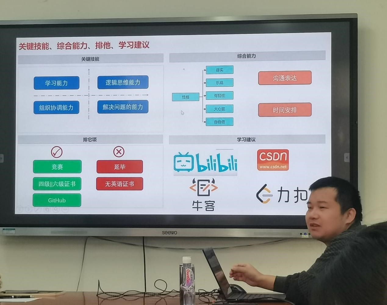 刘小伟和吴摩宇分享了他们的学历背景、工作经历以及如何在本科毕业后进入华为公司。刘小伟作为主讲人,详细阐述了同学们在求职前需要准备的专业知识,包括编程能力、数据库知识、Linux知识以及容器化知识。他还强调了培养关键技能和综合能力的重要性,并提供了宝贵的学习建议。