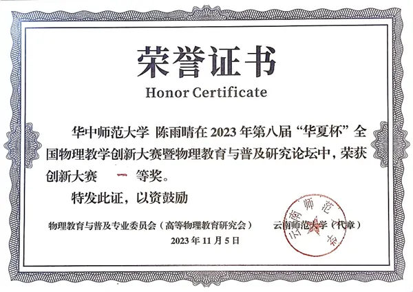 作为一名研究生党员,陈雨晴深知自己的学术和专业技能对于党和人民的事业具有重要意义。在专业技能方面,她不断提升自己的师范技能,积极参加各类教学技能比赛和职业规划大赛,并多次荣获奖项。例如,在国家级“华夏杯”物理教学技能大赛中荣获一等奖;在学院举办的研究生教学创新大赛获二等奖、教具设计与制作大赛中获二等奖;在大学生职业规划大赛获校级优秀奖、院级二等奖。