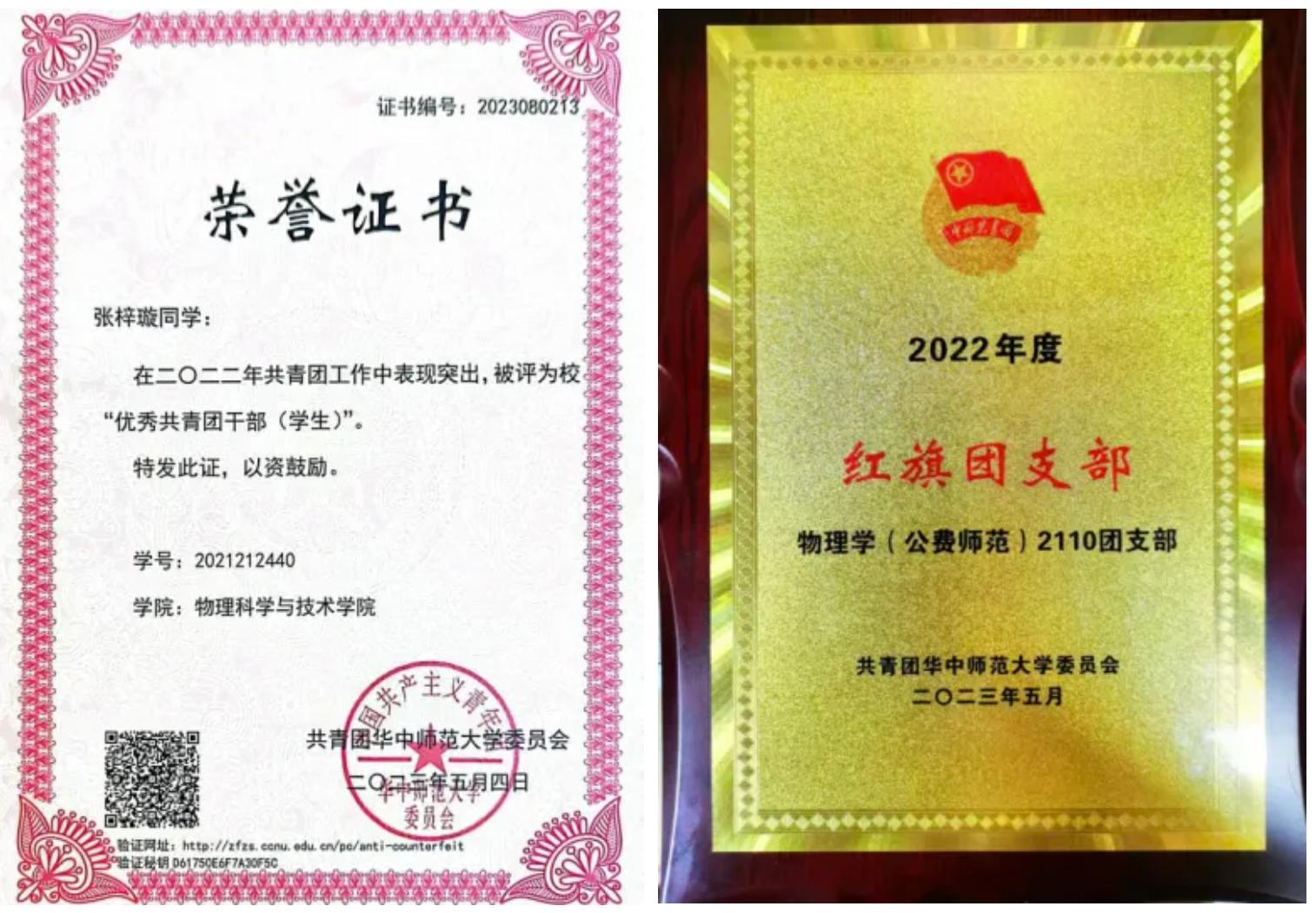 张梓璇在为老师和同学们服务的过程中也注重提升自我,曾获校“优秀共青团干”荣誉称号。作为学生团委副书记,她参与全校团支书培训1班的组织工作,组织策划学院团干培训、科创大赛等各项活动。作为班级组宣委员,她积极参与班级各项活动的组织与比赛评选,团支部获评华中师范大学“百生讲坛”活力团支部评选活动一等奖、校“红旗团支部”等校集体荣誉五项。