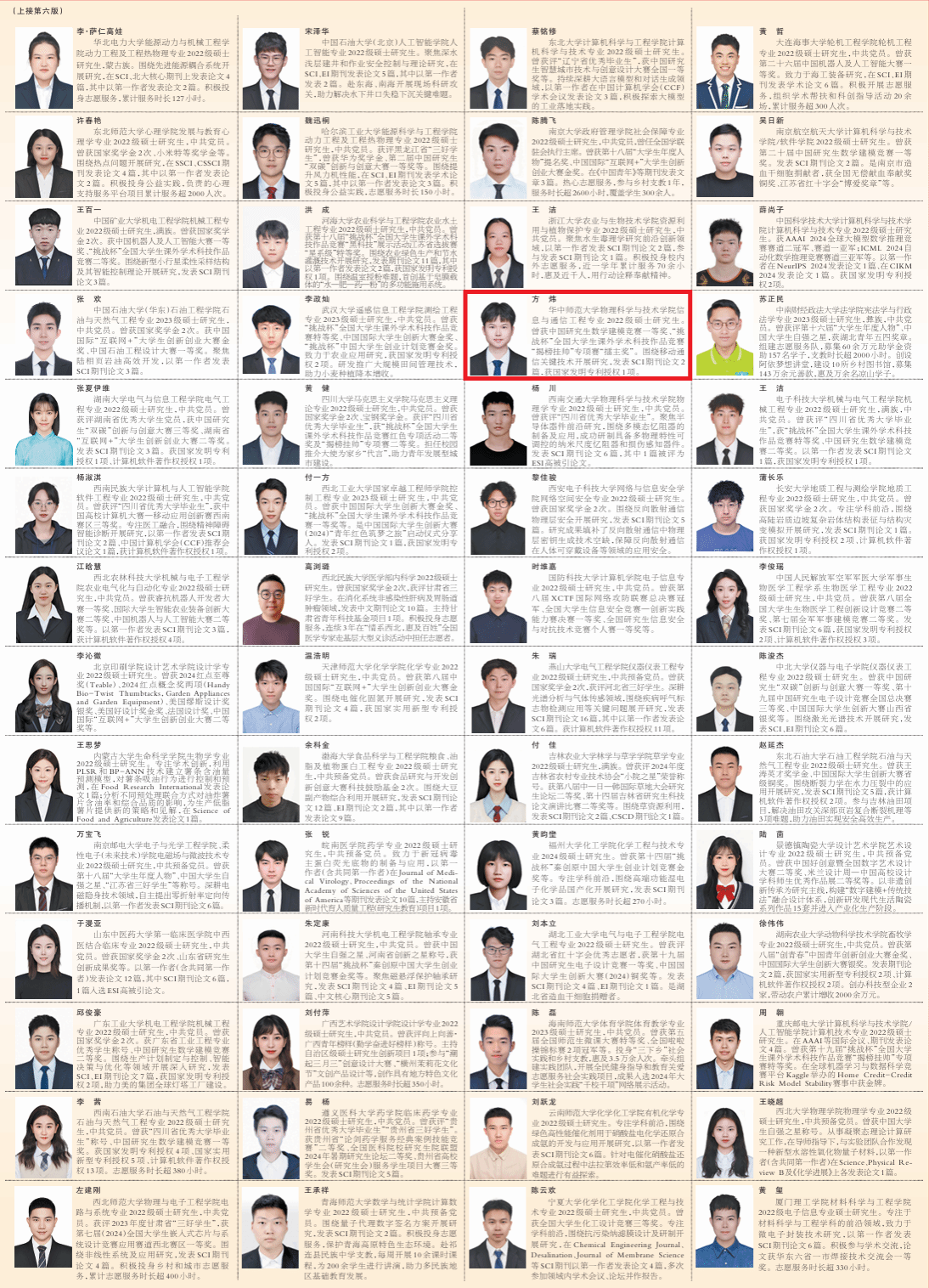 2025年5月5日,《人民日报》整版刊登《2024年研究生国家奖学金获奖学生代表名录》,经过严格选拔和评审,全国9万名研究生荣获2024年研究生国家奖学金。此次名录遴选了研究生国家奖学金获奖学生中的100名优秀代表,并展示其事迹风采。物理科学与技术学院信息与通信工程专业2022级硕士研究生方炜光荣上榜。