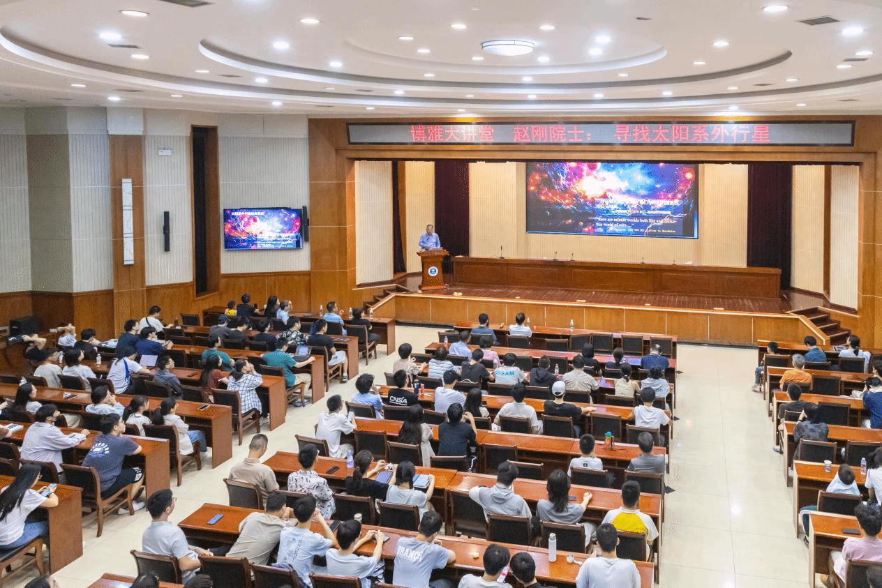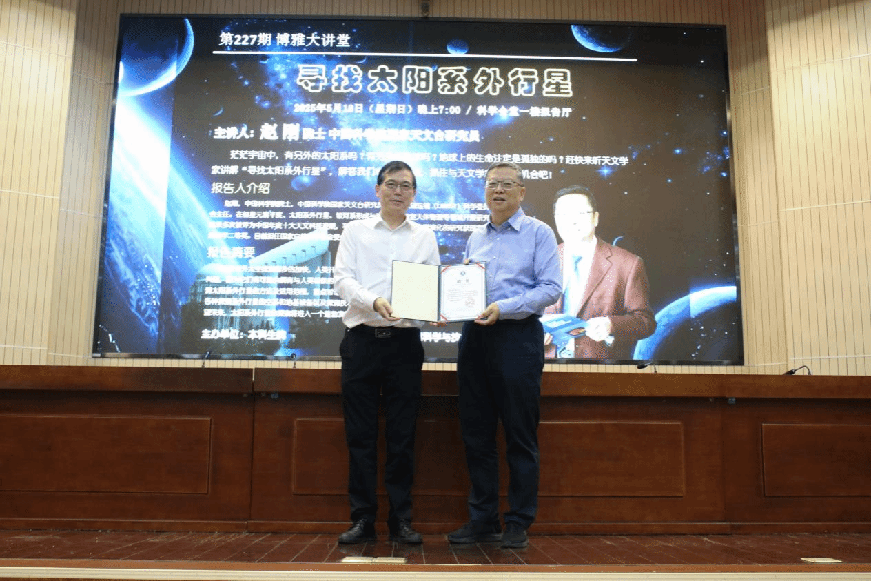 2025年5月18日,中国科学院院士、国家天文台研究员、郭守敬望远镜(LAMOST)科学委员会主任赵刚研究员应邀做客华中师范大学第227期“博雅大讲堂”,在科学会堂一楼报告厅为我校师生作题为“寻找太阳系外行星”的专题讲座。华中师范大学党委副书记陈迪明为赵刚院士颁发“博雅大讲堂”主讲人聘书,物理科学与技术学院院长秦广友主持讲座,四百余名师生到场聆听。