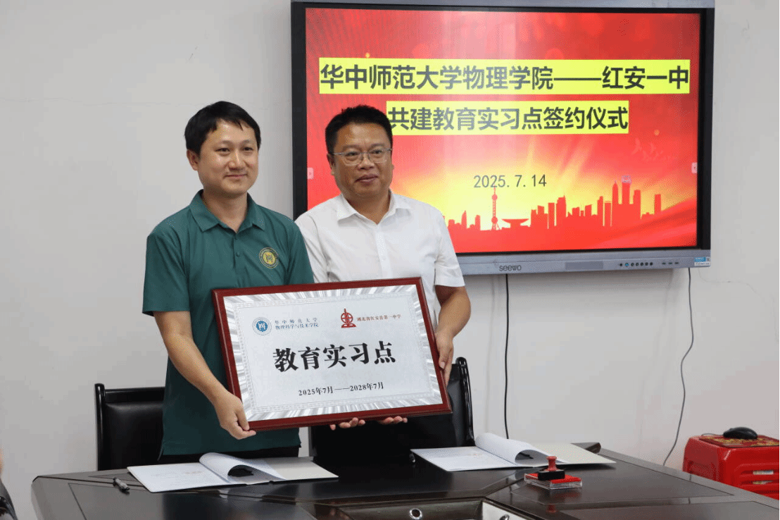 仪式上,华中师范大学物理学院与红安一中举行共建实习点签约仪式,施梳苏与汪绪林共同完成签约并授牌。