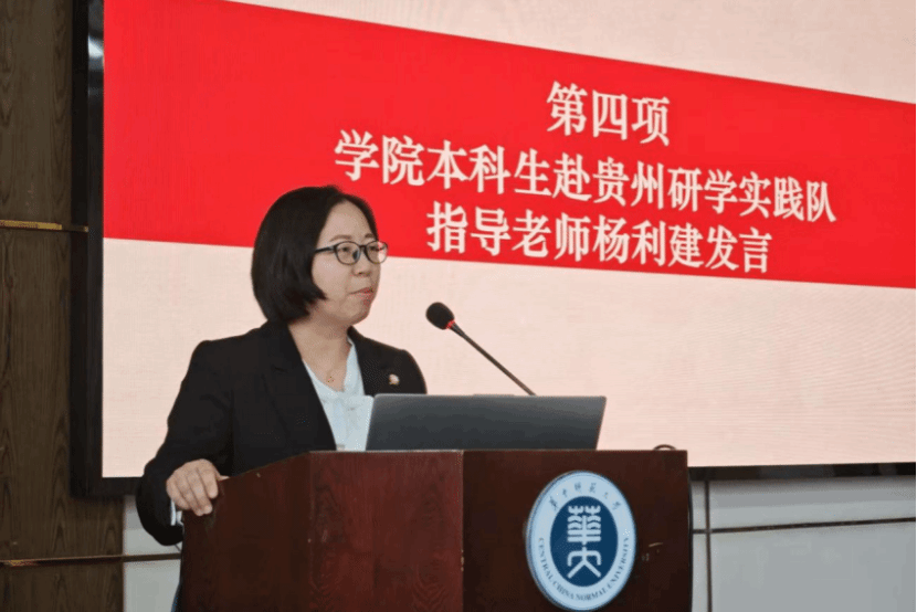 随后,学院社会实践先进个人代表李悦男、学院优秀实践团队代表陈林和学院本科生赴贵州研学实践队指导老师杨利建依次发言,分享实践故事与感悟。李悦男和陈林分别为大家分享了赤壁和贵州的实践经历。杨利建老师带领大家回顾了学院本科生赴贵州研学实践队的实践经历。她提到,此次实践带给了她许多感动。实践前期,实践队员认真准备课程,并进行线下评课磨课活动,为实践做了充足准备。实践活动中,实践队伍去往遵义师范学院论教、前往玉溪中学支教,同时还去往遵义会议会址等地学习红色文化,参观了中国天眼科普基地,探索苍穹的奥秘。此次实践的顺利完成,是所有实践队员努力的成果。与会人员在他们情感真挚的发言中,再次回顾了各个队伍的实践历程,深刻感受到实践队员们蓬勃的青春力量与坚定的使命担当。